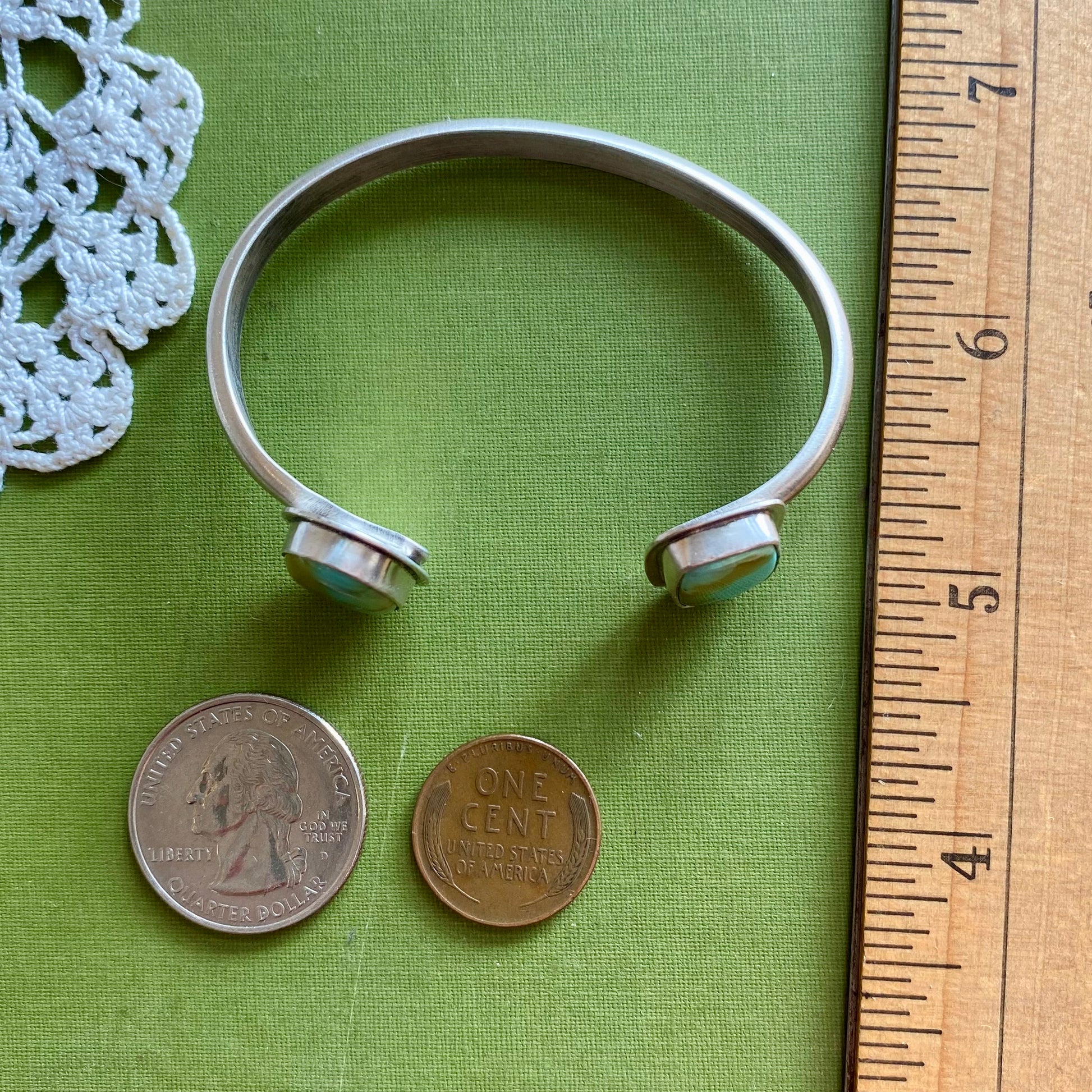Details: plain silver half round cuff, open cuff design with two stones