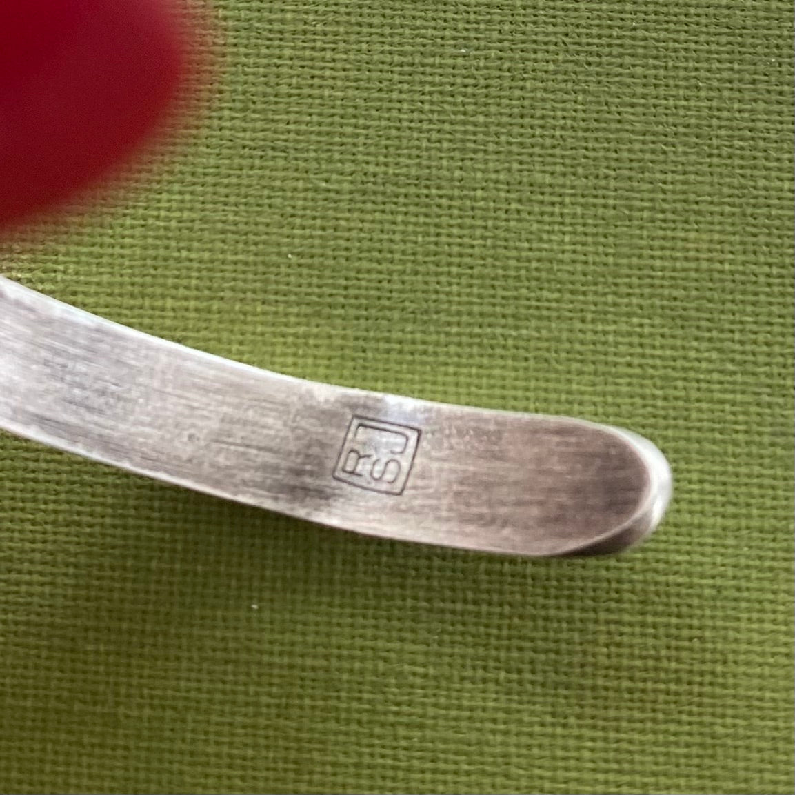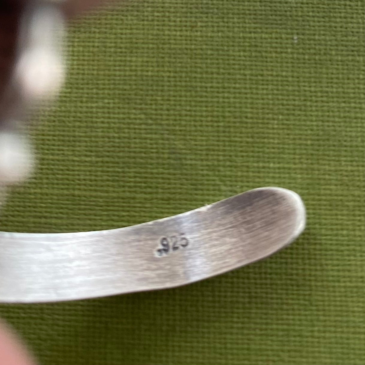 Details: Hand stamped, hand forged details, ball shot detailing, half round wire, pierced back, translucent stone