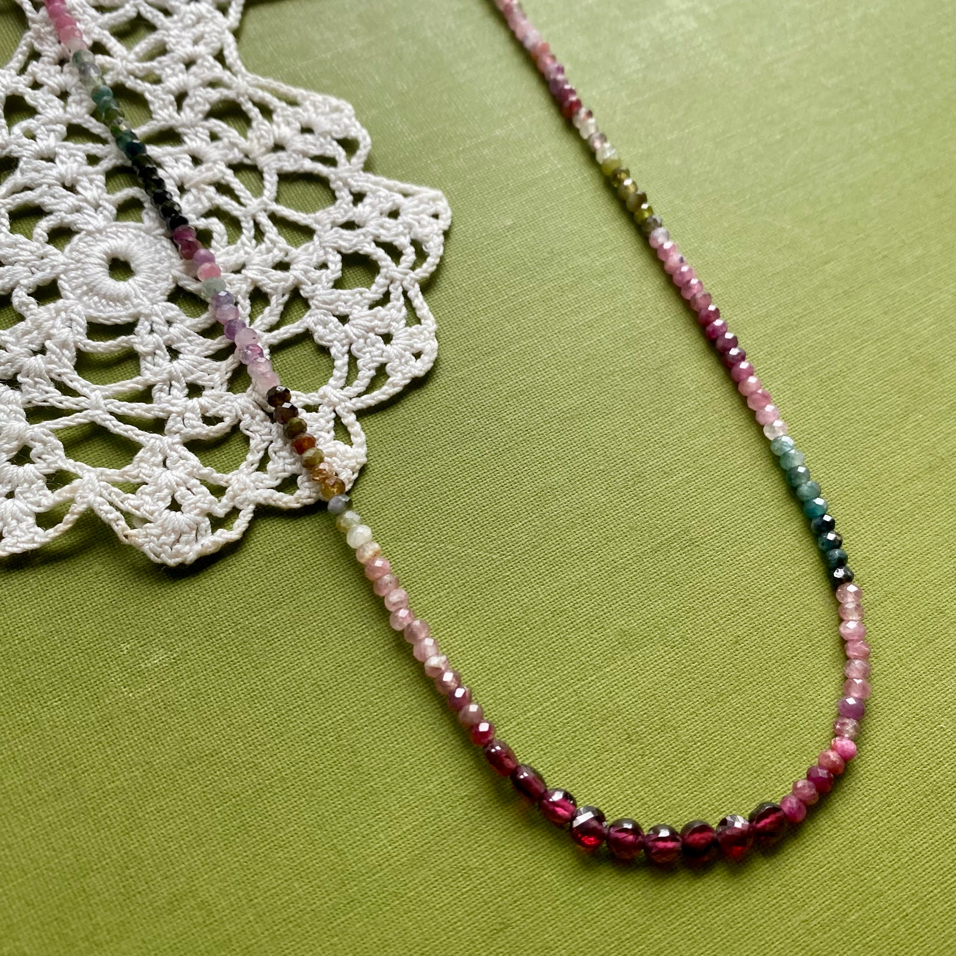 Details: faceted coin shaped garnet and rainbow tourmaline beads