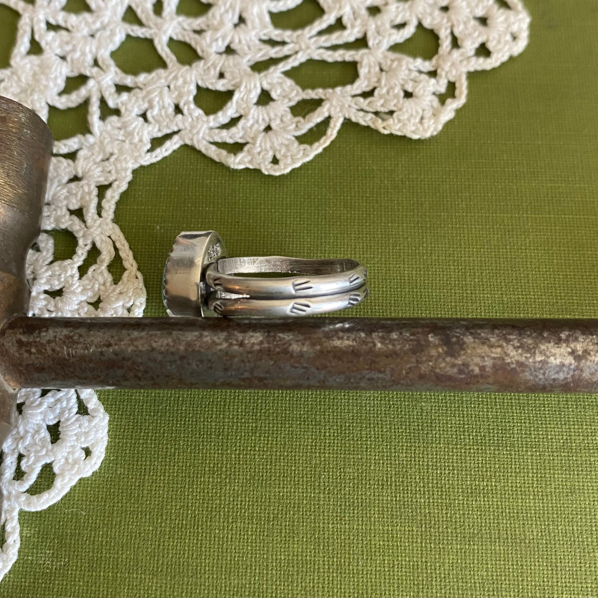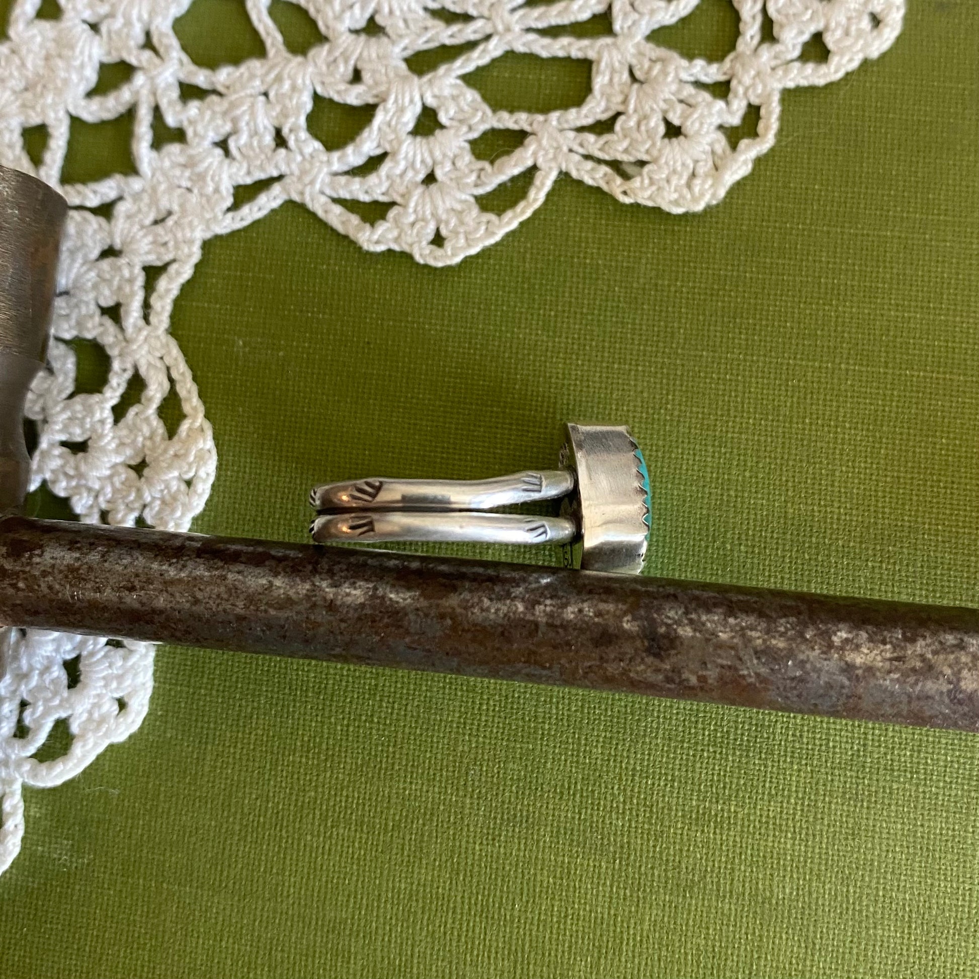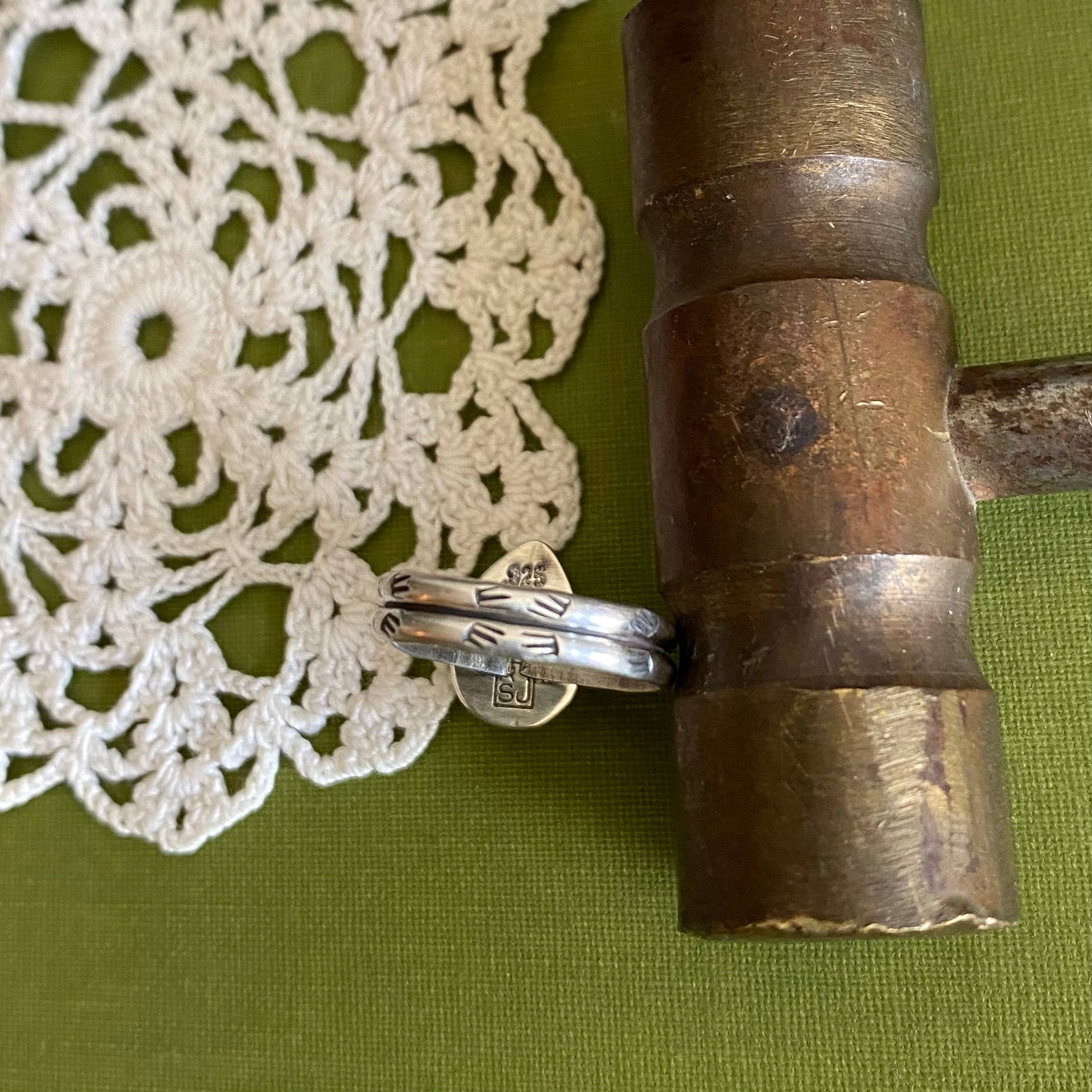 Details: Hand stamped and hand forged details, split shank hand stamped ring band