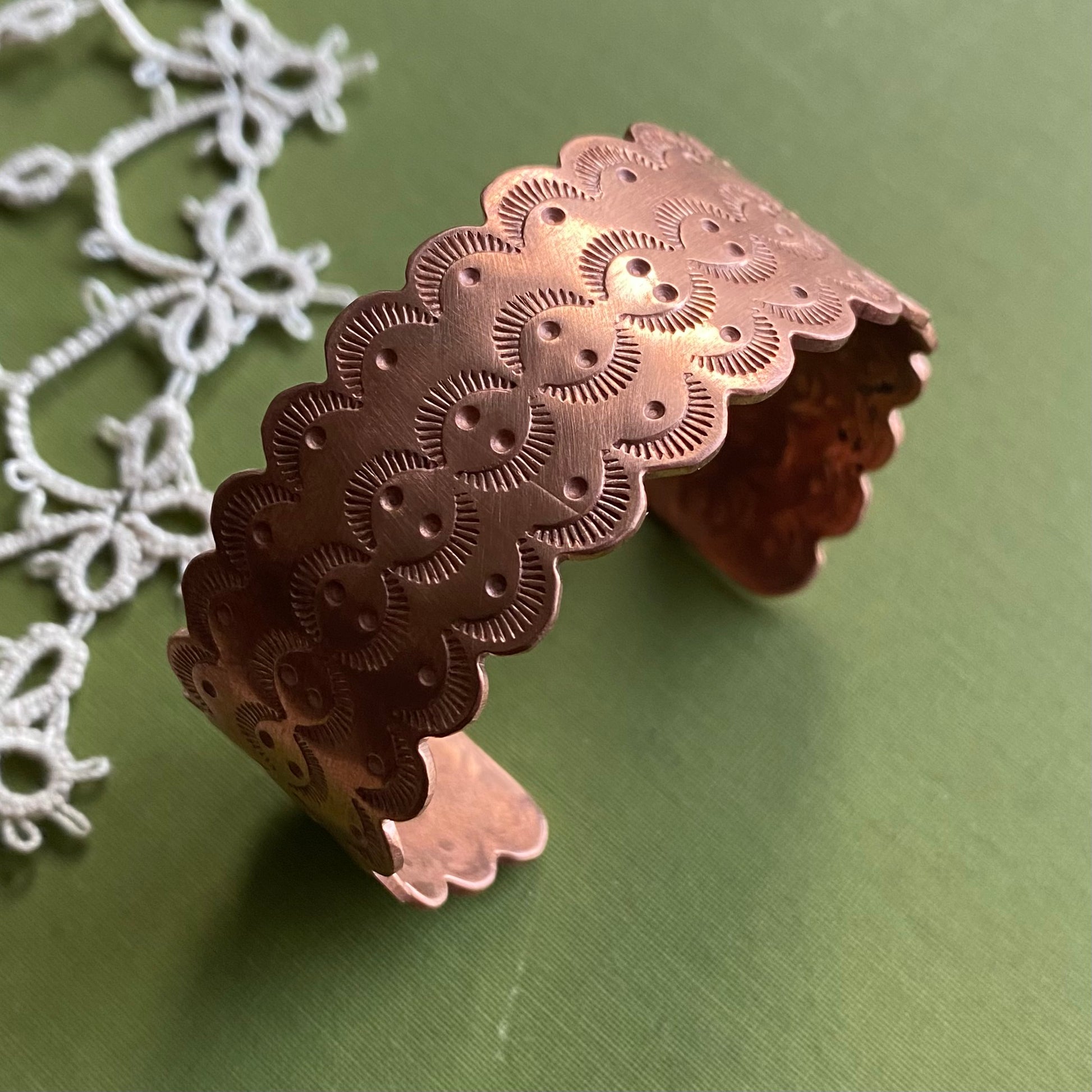 Details: heavy 16g copper, hand stamped and sawed details